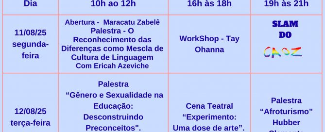 De 11 a 14 de agosto de 2025 | IFSP - Campus Cubatão | Atividades presenciais e híbridas. O Instituto Federal de São Paulo – Campus Cubatão realiza a I Semana Cultural das Diferenças, um evento que convida a comunidade a refletir sobre diversidade, inclusão e representatividade por meio da arte, da educação e da troca